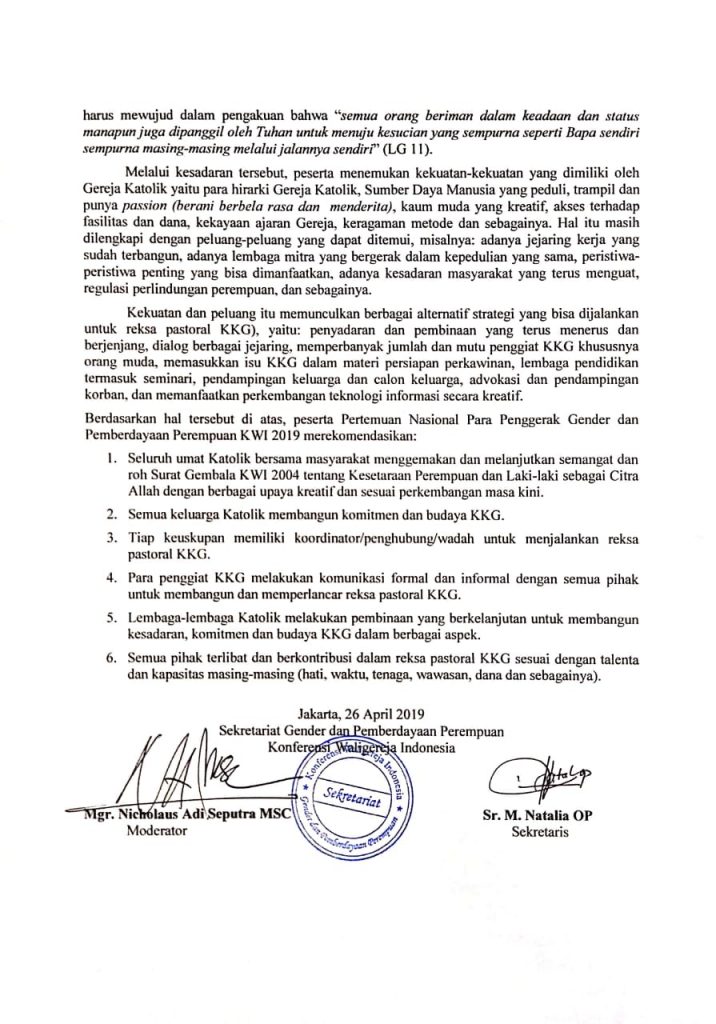 Jakarta, dokpenkwi.org – Ajang Pertemuan Nasional (Pernas) SGPP KWI 2019 dengan tema “Kesetaraan Perempuan dan Laki-laki Dalam Keluarga Sebagai Citra Allah” yang digelar sejak 23 April hingga 26 April sudah selesai.Setelah selama empat hari tiga malam berinteraksi dan mendapatkan pencerahan dari para narasumber maupun diskusi-diskusi di antara peserta, akhirnya mereka menghasilkan sebuah rekomendasi bagi gerak reksa pastoral keadilan dan kesetaraan gender (KKG) di masa depan. Berikut ini disampaikan rekomendasi hasil Pernas tersebut: